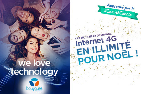Cela est maintenant habituel, Bouygues Télécom organise régulièrement des week-ends de surf illimité, et en ce dernier repos hebdomadaire, l’opérateur a décidé de réitérer son expérience. En effet, en ce long week-end des 25, 26 et 27 décembre 2015, Bouygues Télécom offre à tous ses clients (forfaits Sensation, B&YOU, prépayés et clients pros), ainsi que pour ceux qui ont une offre Bbox Nomad (hotspot 4G), un nouveau week-end data illimitée!