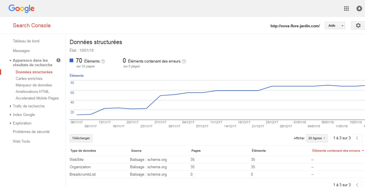 La première des sous-sections permet de savoir si votre balisage sémantique a bien été intégré par Google. Le balisage sémantique permet au moteur de recherche Google d’afficher les résultats enrichis de vos pages sous la forme de rich snippets (avis sur un produit, notes, nombre de commentaires …).