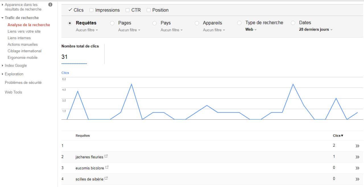 Sûrement l’une des parties les plus importantes de Google Search Console. Elle permet d’apprendre en profondeur le trafic naturel de votre site internet et répondre à certaines interrogations. D’où viennent les visiteurs de votre site ? Par quel mots-clés ? Quelle stratégie de maillage de lien interne adopter ? Quels liens pointent vers votre site ?