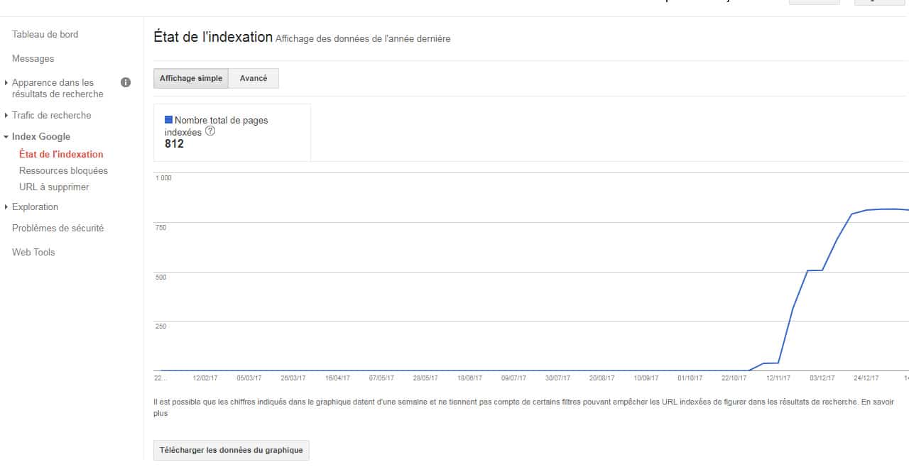 Point important, cette catégorie permet de connaitre les pages indexées et donc répertoriées par Google et susceptibles d’être affichées dans les résultats de recherche de Google. Vous trouverez ici l’évolution du nombre de pages indexées par Google (généralement une courbe croissante).