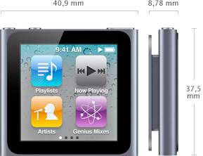21 grammes de technologie Apple avec accéléromètre, écran tactile multipoints de 1.5 pouces, fonction VoiceOver, tuner FM, il est pourvu d’un système simplifié de l’OS Apple pour une facilité d’utilisation exemplaire. Disponible en 7 couleurs, doté d’une pince, il vous suivra partout avec son autonomie de 24 heures en lecture et nécessite iTunes 10 pour la synchronisation. 2 tarifs sont proposés : Nano 8 Go à 169 € et Nano 16 Go à 209€.