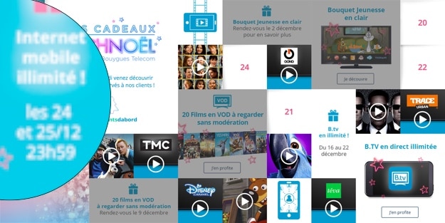 Noël approche à grands pas et vous vous préparez très certainement à être gâtés comme tous les ans. De leur côté, depuis le 1er décembre, beaucoup d’enfants ouvrent chaque jour leur calendrier de l’Avent pour y découvrir, en règle générale, un bon chocolat. Mais savez-vous qu’aujourd’hui, sur Internet, il existe beaucoup de calendriers mis en place sur beaucoup de sites pour le plaisir de tous? C’est notamment le cas de l’opérateur Bouygues Telecom. Si je vous en parle aujourd’hui c’est tout simplement que le cadeau du jour concerne l’ensemble des clients de Bouygues puisque c’est le retour d’un weekend illimité d’Internet mobile !