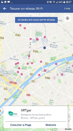 Facebook vous propose alors la liste des réseaux gratuits disponibles. Elle se présente sous forme d’une liste ou sur une carte avec autant de points qu’il y a de Wi-Fi autour de vous (et à quelle distance de votre emplacement).