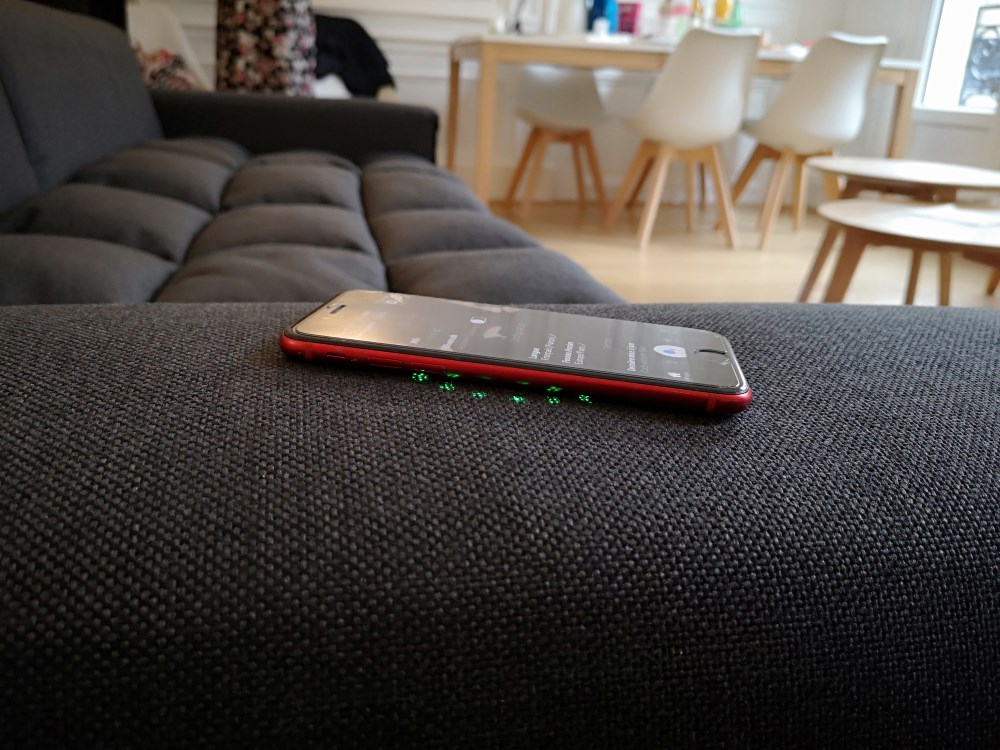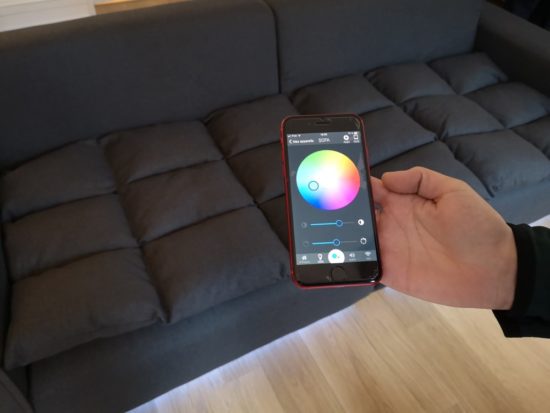 Enfin, en bas du canapé et uniquement devant, le canapé propose un éclairage led RGB dont il est possible de définir la couleur. Ça donne un effet visuel assez sympa qui doit l’être encore plus si la pièce est plongée dans le noir. J’espère voir le produit évoluer pour proposer un éclairage dynamique en fonction de la musique ou du film.