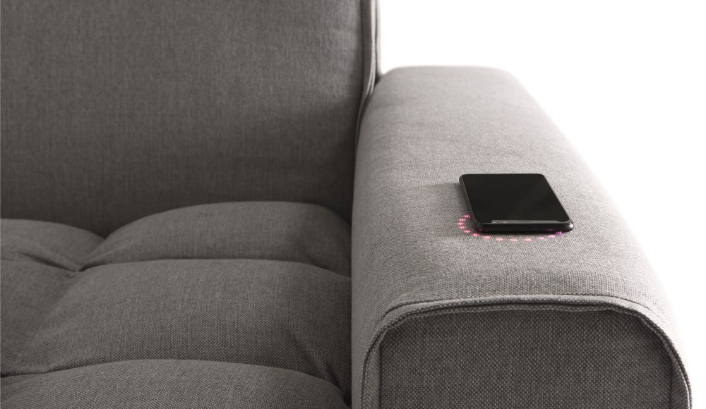 Si vous avez l’occasion de vous poser dans ce smart sofa, je vous conseille de prendre place à côté de l’accoudoir droit. On y trouve le chargeur sans fil ainsi que les assistants vocaux Amazon Alexa et Google Home. Pendant ces quelques instants de découverte, ce dernier a fonctionné mais a été quelque peu capricieux. Cela ne m’a pas empêché de me projeter. Je me voyais déjà assis dans mon canapé en train de lancer des commandes vocales pour piloter mes appareils connectés.