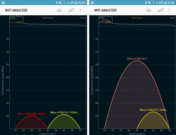 Voici quelques screenshots réalisés depuis l’application WiFi Analyser avec le signal de la box avant et après branchement du devolo Wi-Fi repeater ac, positionné à l’étage du dessous et dans une pièce opposée à la box.