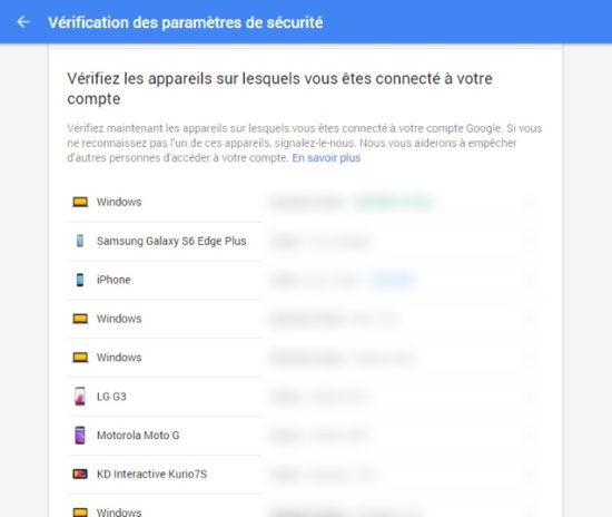 La deuxième étape consiste à vérifier la liste des appareils sur lesquels vous vous êtes connectés, du smartphone jusqu’à l’ordinateur en passant par la tablette. En cliquant sur l’appareil, vous découvrirez un ensemble d’informations : nom de la machine, navigateur utilisé, derniers lieux où l’appareil a été utilisé. L’objectif est d’identifier les éventuels appareils « suspects ».