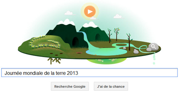 Cela n’a pas pu vous échappé, mais en ce 22 avril 2013, Google nous a gratifié d’un tout nouveau Doodle comme il l’avait l’année passée à la même occasion! En effet, nous sommes le 22 avril et ce jour très spécial célèbre la Journée de la Terre! Google a donc décidé de fêter cet évènement à sa façon avec un Doodle vraiment très réussi! Effectivement, comme vous le remarquera, ce dernier est interactif pour notre plaisir à tous et je ne me souviens pas que la firme de Mountain View ait déjà mis en ligne une telle création si aboutie. Je vous laisse le soin de cliquer pour découvrir pourquoi je dis cela.