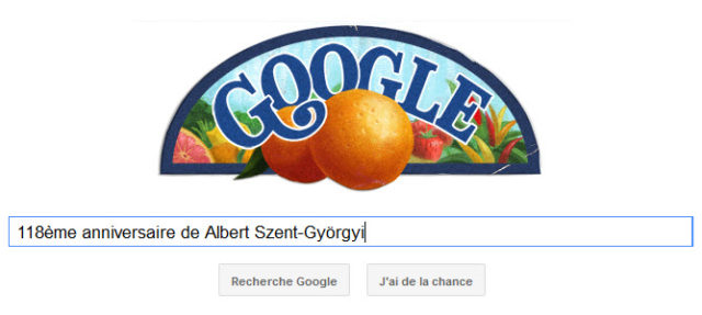 Aujourd’hui, comme vous l’avez certainement remarqué, Google a laissé place à son logo classique à un nouveau Doodle. L’évènement célébré aujourd’hui est le 118ème anniversaire d’Albert Szent-Gyorgyi. Albert Szent-Györgyi de Nagyrápolt est né le 16 septembre 1893, il y a 118 ans donc, à Budapest et mort 22 octobre 1986 à Woods Hole dans le Massachusetts. C’était un scientifique hongrois qui a reçu en 1937 le prix Nobel de physiologie ou médecine pour avoir entre autres découvert la vitamine C et les flavonoïdes initialement appelée vitamine P. Cette dénomination fut abandonnée lorsqu’on se rendit compte que ces substances ne correspondaient pas à la définition officielle des vitamines, dans la mesure où on ne les considère pas comme étant essentielles à la vie.