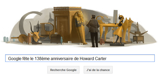 Si hier, Google a célébré de manière très discrète le 8 mai 1945 en ajoutant une simple et petite fleur sur la page d’accueil du moteur de recherche, aujourd’hui, retour au Doodle bien plus classique. En effet, depuis ce matin, le firme de Mountain View a remplacé son logo par un tout nouveau Doodle qui, comme dans la majorité des cas met en avant un personnalité qui a marqué l’histoire. Aujourd’hui, Google fête le 138ème anniversaire de Howard Carter. Non, il ne s’agit pas du célèbre joueur de basketball aujourd’hui français mais de l’archéologue. Effectivement, Howard Carter, né à Kensington (Londres) le 9 mai 1874 et mort à Londres le 2 mars 1939, était un archéologue et égyptologue britannique. Fils d’un peintre animalier dont il hérite les talents de dessinateur, Howard Carter est engagé à 17 ans pour recopier à l’aquarelle les fresques des tombes de Beni Hassan, site célèbre pour la découverte du tombeau de Khnoumhotep II, nomarque de la XIIe dynastie.