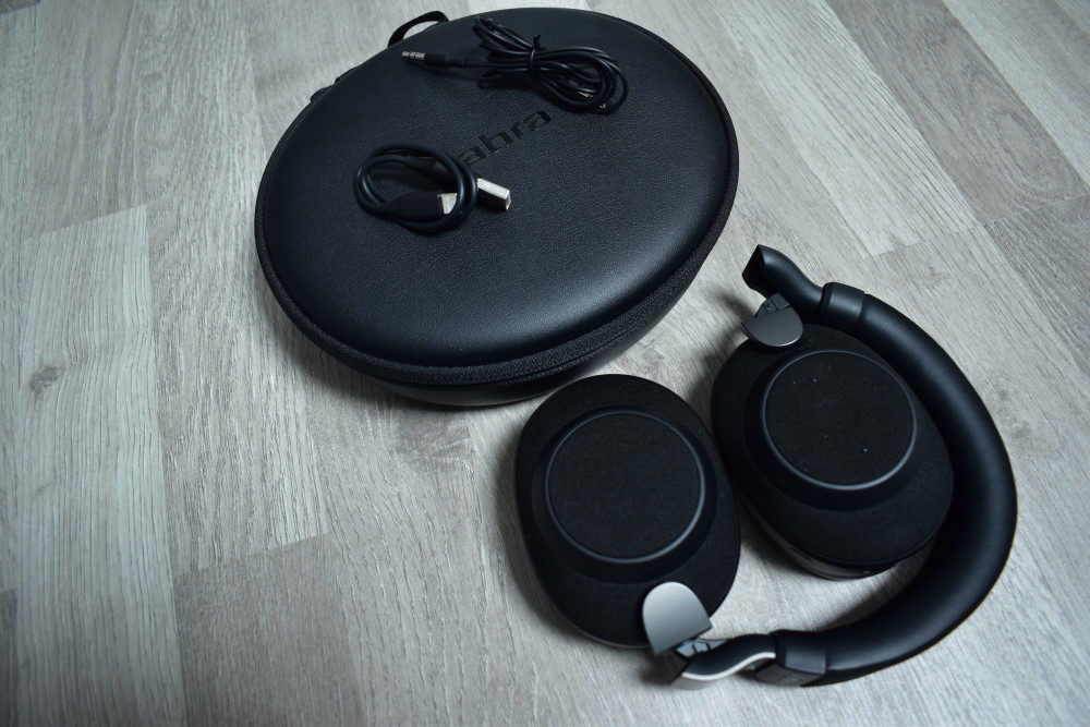 Revenons sur cet étui noir de belle facture dont une référence à la marque apparaît sur le dessus ainsi qu’au niveau de la fermeture éclair. C’est à l’intérieur que l’on trouve le casque Elite 85h en position replié. Ce n’est pas le seul contenu. Jabra y a également glissé deux câbles et un adaptateur prise avion.