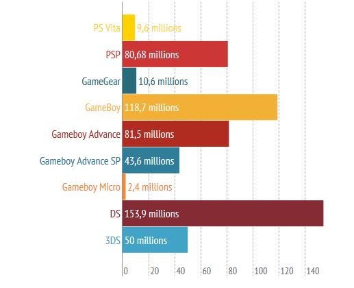 Petit bémol à ce graphique, la Gameboy Advance, son modèle SP et micro ne forme qu’une seule et même entité de génération de console. Avec la même puissance, le même catalogue de jeux et les mêmes fonctionnalités (hormis l’apport de l’écran rétroéclairé apporté par le modèle SP et le design des consoles qui varie) nous avons des consoles similaires, des améliorations aussi, vues avec la Nintendo 3DS avec la modèle de base, la version XL et la 2DS. Bref, si l’on cumule le nombre d’unités vendues de la Gameboy Advance, son modèle SP et micro on obtient 127,5 millions de consoles. Ce qui fait de la Ps Vita actuellement la console portable la moins vendue de tous les temps. Un comble pour Sony qui a façonné la console de salon la plus vendue de l’histoire avec la Playstation 2.