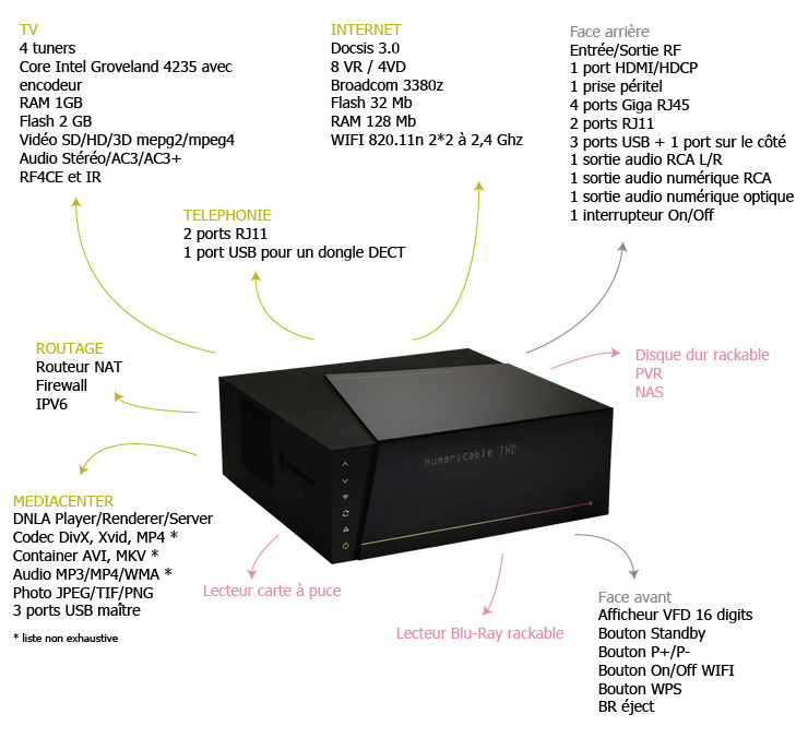 L’actualité de Free Mobile a obligé Numéricable à avancer d’une journée sa conférence de lancement de sa nouvelle Box tout en un. Fini donc les deux boitiers séparés, un pour l’internet et la voix, l’autre pour la TV. Tout est rassemblé dans une unique box fabriquée par Sagem, bourrée de technologie et réservée aux abonnés fibre. La liste des possibilités offerte par cette box est énorme : c’est la « Révolution » attendue du cablo-opérateur. Le design, par contre, fera surement parler.