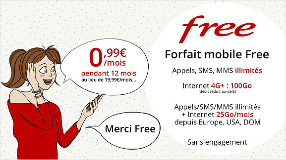 Depuis hier et jusqu’au 22 mars à 6h (pour l’instant…), Free Mobile propose une superbe opportunité pour s’attirer de nombreux nouveaux clients. L’opérateur propose en effet son forfait Appels, SMS/MMS et Internet 100 Go habituellement facturé à 19,99€/mois, à seulement 0,99€/mois pendant 12 mois ou 1 an si vous préférez. Oui, c’est bien une remise mensuelle de 19€ que Free Mobile vous propose alors autant en profiter. Je vous laisse le soin de vous rendre sur le site vente-privee.com pour voir les destinations concernées par les appels et autres.