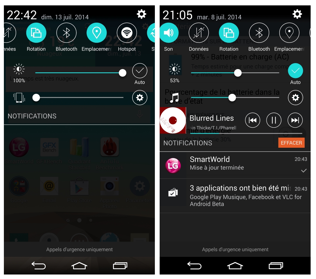 Concernant le volet de notifications, la partie haute est conçue de la même façon que sur le G2 : une barre d’icônes puis, plus bas, les réglages de la luminosité et du son. Par contre, sur le G3, nous retrouvons le flat design évoqué précédemment. De plus, le fond est légèrement transparent. En d’autres termes, on voit, à travers ce volet, la page située derrière. C’est un avis personnel mais je préfère le volet du G2. J’ai l’impression de perdre en lisibilité du fait des icônes de taille plus importante.