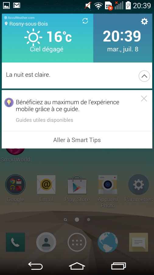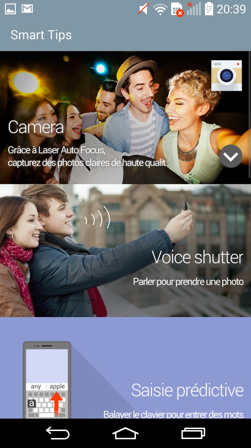 - Smart Tips : Permet de visualiser des astuces, tutoriels et conseils sur certaines fonctionnalités ou nouveautés du smartphone : Laser Autofocus, Knock Code, Cliché avec une seule main.
