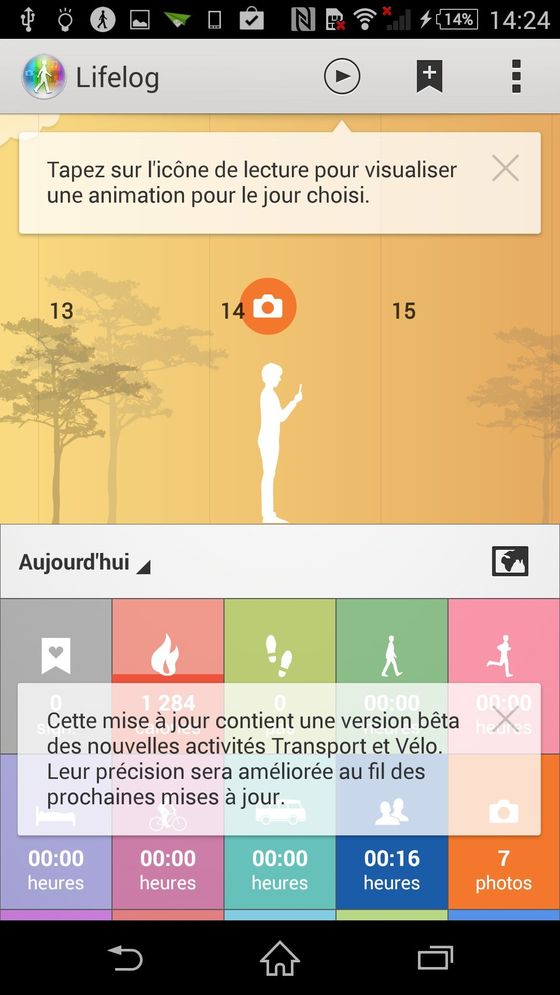 L’installation terminée, l’application se lance… et on découvre une présentation simple et efficace. Si on détaille de haut en bas, sur une première ligne, nous avons un icône de lecture pour voir les activités de la journée défiler, un petit drapeau permettant d’ajouter une note et l’accès aux réglages qui se résument à l’actualisation des données, l’enregistrement de l’activité ou non et la déconnexion. Ensuite, l’écran propose de faire défiler par un mouvement du doigt les heures de la journée et les jours pour y voir apparaître les activités réalisées. Le petit bonhomme se met alors à courir quand on a couru ou se couche au moment où on dort. On découvre ainsi les pictogrammes des différentes actions faites avec le smartphone : les jeux, les prises de photo ou de vidéos, la navigation sur internet, … Les actions sont ici seulement symbolisées à l’heure où elles sont débutées.