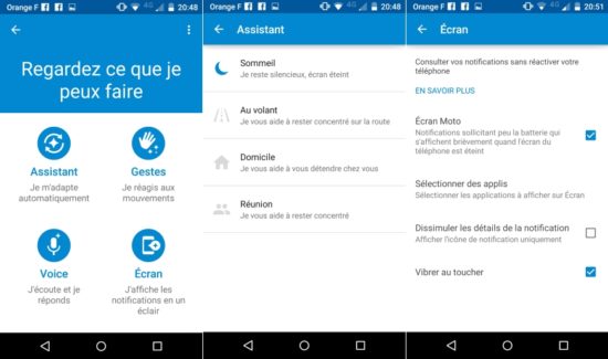 Enfin, il y a l’application Moto qui offre des fonctions supplémentaires au smartphone et qui apprend de votre utilisation. Cela va de la gestion de différents modes (mode Sommeil ou Réunion par exemple) à la commande par gestes (mouvement de poignet pour démarrer l’appareil photo) en passant par un écran qui se « réveille » quand on l’approche en affichant une page noire comprenant uniquement quelques éléments, afin de limiter la consommation de la batterie : un cadenas au centre et le(s) raccourci(s) vers les éventuelle(s) application(s) dans la partie haute. Un mouvement du cadenas vers l’application permettra de la lancer et de visualiser l’information. Un mouvement vers le bas permet de déverrouiller le smartphone.