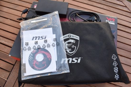 A l’intérieur, le MSI GT72VR est enveloppé dans un tissu de couleur noir avec un logo blanc Gaming G Series. Il est parfaitement maintenu en place par des compartiments en carton contenant l’alimentation et son câble.