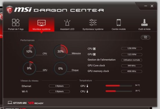 Parmi celles-ci, on trouve MSI Dragon Center, un vrai centre de contrôle de l’ordinateur. Il sert aussi bien de portail vers les autres applications MSI que de moniteur système en passant par des écrans de paramétrage du rétroéclairage et du mode d’utilisation du notebook.
