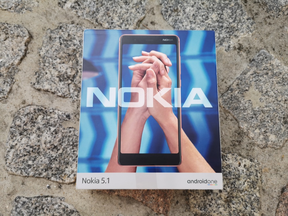 Le smartphone est livré dans une boite carrée de couleur blanche dont la face supérieure est entièrement recouverte d’un visuel de l’appareil. Sur une ligne située tout en bas, on lit le nom du modèle – Nokia 5.1 – d’un côté et le système d’exploitation – Android One – de l’autre.