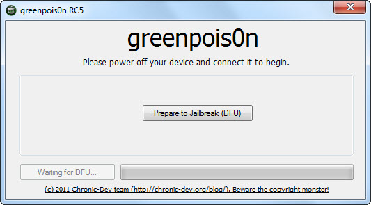Connectez votre appareil Apple au PC et éteignez le. Exécutez le logiciel Greenpois0n et suivez les indications.
