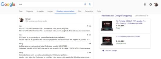 Me concernant, en plus de retrouver la publication de mon dernier test, il affiche un article précédent, celui sur MSI cherchant à sponsoriser des équipes de joueurs. Google me retrouve aussi la mise en vente de mon MSI GT683 sur Ebay et sur Le Bon Coin mais aussi des références de machines MSI envoyées à une connaissance qui recherchait un PC portable pour jouer.