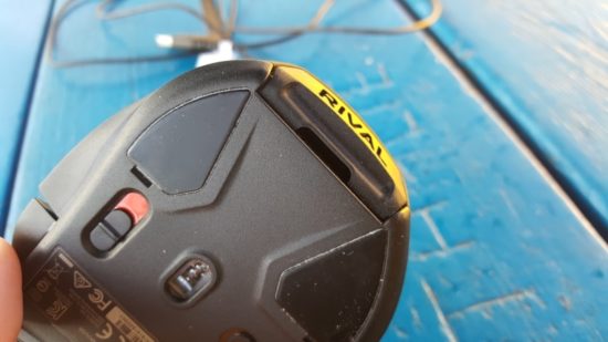 Si vous retournez la souris, en plus des larges patins facilitant le déplacement de la souris, la Rival 500 cache un interrupteur mécanique permettant d’activer et de désactiver les deux boutons présents sous le pouce, ceux évoqués un peu plus haut.