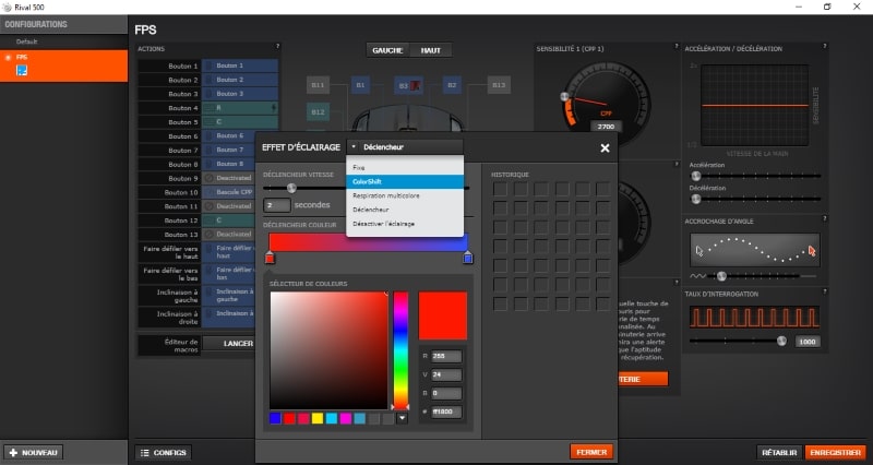 Depuis l’application, vous pouvez également intervenir sur d’autres paramètres qui peuvent être différents suivant les profils créés : accélération, décélération, sensibilité, taux d’interrogation et accrochage d’angle. Pour les gamers les plus assidus, il est possible de créer des macros