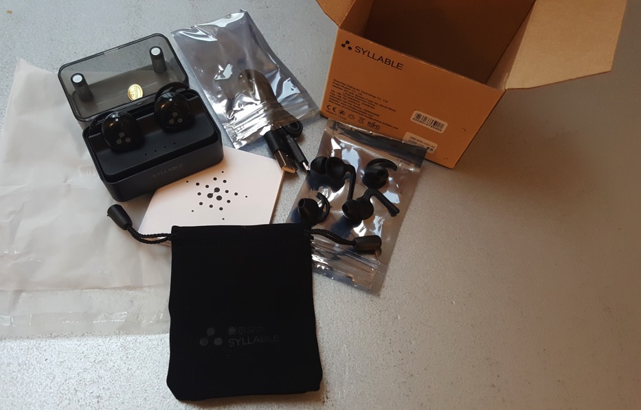 Livrés dans un emballage fait de carton épais, à l’ouverture de ce dernier, on découvre les accessoires (câble micro-USB et les embouts de différentes tailles emballés dans des emballages hermétiques), une housse de transport ce qui est toujours agréable, la notice d’utilisation en français, et enfin une petite boîte rectangulaire dans lequel se nichent les écouteurs Syllable D900 Mini.