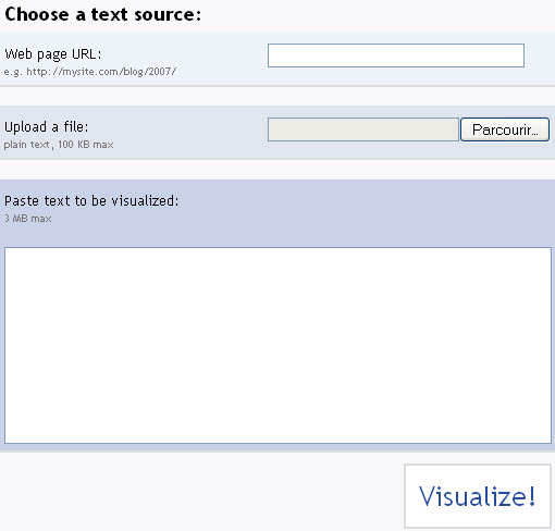 TagCrowd va vous permettre de créer vos nuages de tags à partir de n’importe quelle source écrite… une page web, un document texte ou bien en saisissant simplement votre texte… puis générez votre nuage en cliquant sur Visualize.