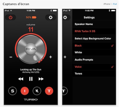 A l’usage, je vous conseille de télécharger l’application Riva Turbo (uniquement en anglais) qui va avec, disponible sous Google Android ou Apple iOS. Celle-ci, certes simple, permet de contrôler un peu plus facilement encore l’enceinte : on peut alors changer les notifications en paroles ou en sons, visualiser plus facilement la charge de batterie, changer les pistes audio, accéder au bouton play/pause.