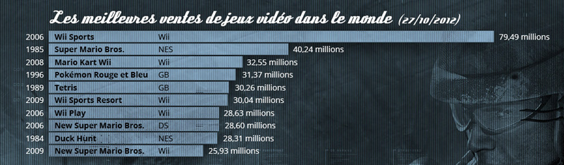 Aujourd’hui j’avais envie de vous faire partager des chiffres. Loin d’être un adepte des maths, je suis pourtant un grand allié des statistiques. J’adore façonner des tops, analyser le pourquoi du comment à l’aide de données chiffrées. Et quand celles-ci sont liées aux jeux-vidéo alors je suis aux anges. Aujourd’hui je vous fais part d’un classement qui ne risque pas de changer de sitôt : le top 10 des meilleures ventes de jeux vidéo de l’histoire.