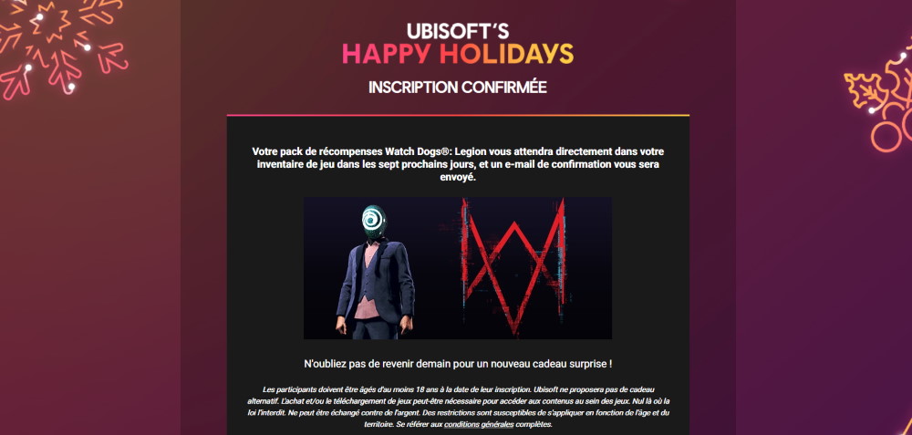Avec son opération Ubisoft Happy Holidays, Ubisoft annonçait offrir du contenu gratuit tous les jours entre le 14 et 18 décembre. Cela avait démarré avec la tenue de Balek pour se poursuivre avec le titre Starlink. Si vous vous êtes connectés sur le site ou sur Ubisoft Connect PC, vous avez découvert l’offre du jour. Ubisoft offre une récompense pour Watch Dogs Legion.
