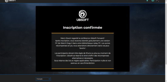 Hier, il était possible de remplir un formulaire pour récupérer nos récompenses, formulaire disponible jusqu’au 15 juillet. C’est aujourd’hui et pourtant, les inscriptions semblent closes. Le bandeau est pourtant toujours présent en haut de la page Ubisoft. Il est vrai que je n’avais pas vérifié si c’était le 14/07 au soir au le 15/07. Ce verrouillage est étonnant quand on peut lire sur cette page How to Claim Ubisoft Forward Rewards l’information suivante : « before July 16th 08.59 am CEST ». C’est peut-être juste un (nouveau) problème temporaire.